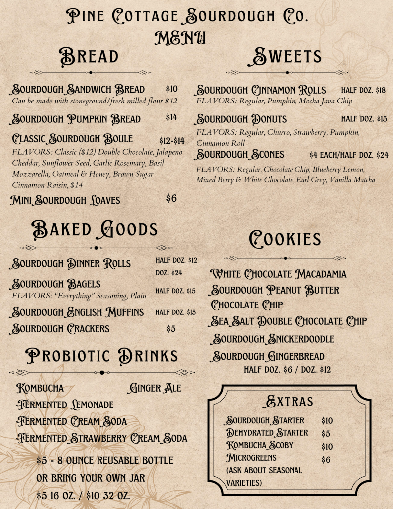 Attention friends! Check out my microbakery, Pine Cottage Sourdough Co.! I make small batch sourdough bread and other baked goods, as well as organic kombucha and fermented drinks.